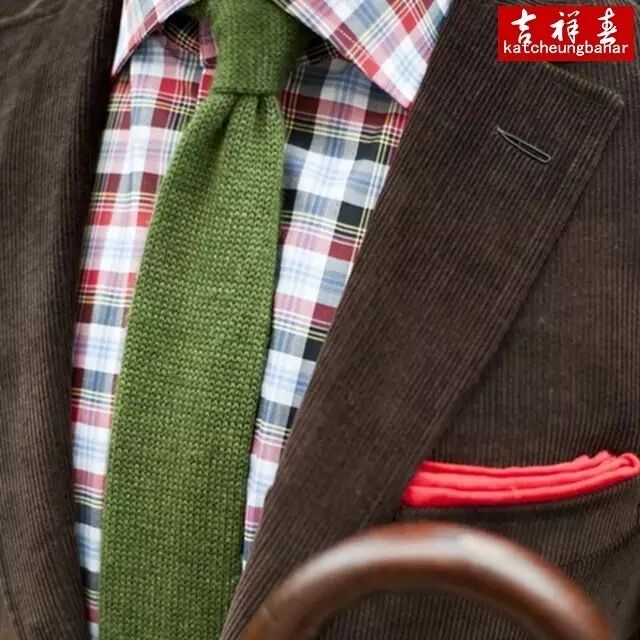 针织领带大多为纯色或条纹样式,其实这和设计师的个人偏好并无关联。因为针织织物拥有独特的织法,想要在针织织物上呈现其他的个性化的图案,是一件非常不容易的事。所以,市面上的针织领带,大部分以纯色或条纹面貌示人。至于为何末端呈现的是方头,而不是传统的尖头,说法不一,但很容易让人联想起50年代盛行的Rockabilly的音乐生活态度,感觉到轻松自由的气氛。