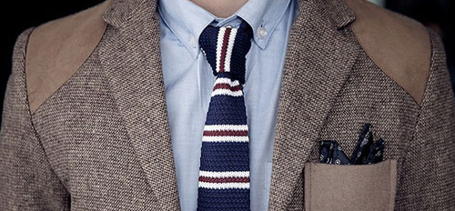 针织因为较少男子气,曾经长期被划分在“学校制服”和“Schoolboy”的区域内。直到80年代,思潮下,被主流衣着观念控制的男士们开始意识到自己可以拥有一点时髦。男人衣领的V区作为视觉焦点所在,从来是重要领地,气度品位都能从这片小小的方寸之地传递出去,因此在当时的时尚先锋们,那些嬉皮士和EMO乐手首先选择在自己的脖子上挂上一条与众不同的东西——针织领带。与70年代流行的丝缎领带的宽大厚实和细腻光滑不同,细窄的针织领带表面肌理感十足,末端还是约为